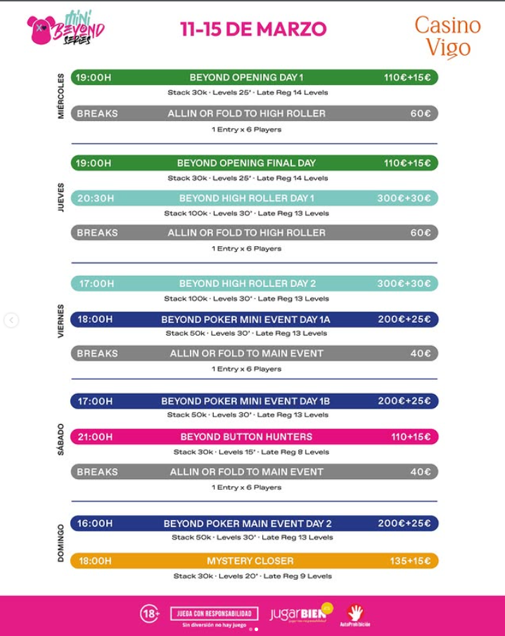 Del 11 al 15 de marzo, el Casino de Vigo acoge una nueva edición del Torneo de Póker Beyond, que se desarrollará a lo largo de varias jornadas consecutivas.